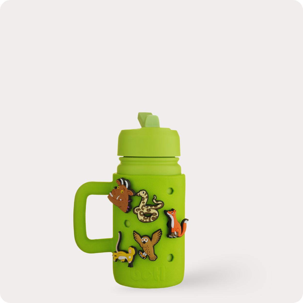 This Gruffalo Green water bottle comes with the set of 5 main character bottle bits including featuring The Gruffalo himself, Mouse, Owl, Snake, and Fox.